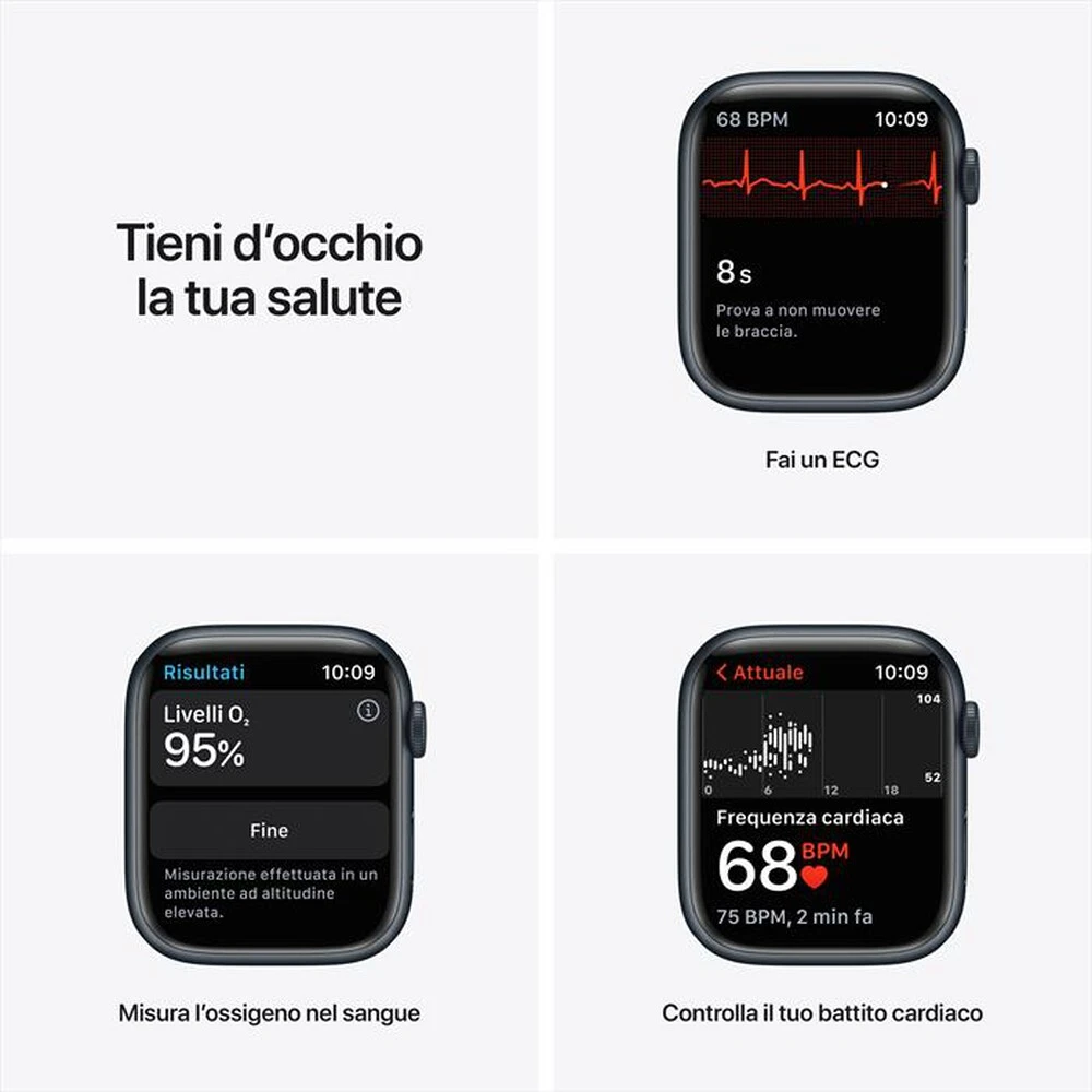 Formidabili novità per la salute e il benessere. Misura i livelli di ossigeno nel sangue grazie a un sensore e un’app rivoluzionaria. Fai un ECG quando vuoi, dove vuoi. Controlla il tuo battito cardiaco. E prenditi cura del tuo benessere generale con le funzioni innovative per la mindfulness e il monitoraggio del sonno. Con l’app ECG, Apple Watch Series 7 è in grado di generare un elettrocardiogramma a singola derivazione. L’App Sonno ti aiuta a creare una routine della buonanotte e mentre riposi, monitora persino la tua frequenza respiratoria. Ricarica fino al 33% più veloce. Display Retina always-on più grande ed evoluto di sempre. Linea morbida e continua. Cristallo anteriore geometricamente irrobustito. Resiste alla polvere. Certificazione IP6X. Resiste all’acqua fino a 50 metri.