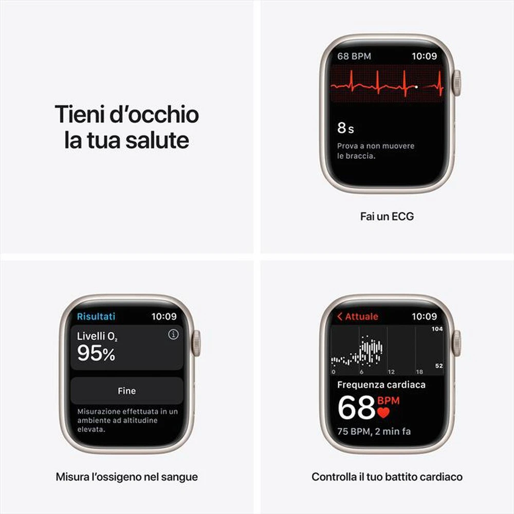 Formidabili novità per la salute e il benessere. Misura i livelli di ossigeno nel sangue grazie a un sensore e un’app rivoluzionaria. Fai un ECG quando vuoi, dove vuoi. Controlla il tuo battito cardiaco. E prenditi cura del tuo benessere generale con le funzioni innovative per la mindfulness e il monitoraggio del sonno. Con l’app ECG, Apple Watch Series 7 è in grado di generare un elettrocardiogramma a singola derivazione. L’App Sonno ti aiuta a creare una routine della buonanotte e mentre riposi, monitora persino la tua frequenza respiratoria. Ricarica fino al 33% più veloce. Display Retina always-on più grande ed evoluto di sempre. Linea morbida e continua. Cristallo anteriore geometricamente irrobustito. Resiste alla polvere. Certificazione IP6X. Resiste all’acqua fino a 50 metri.