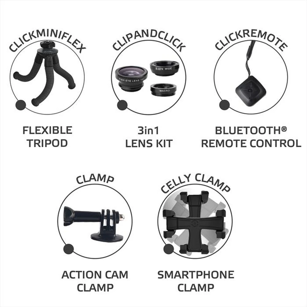 MINIFLEX CLAMP REMOTE LENS KIT – MINIFLEX CLAMP REMOTE LENS KIT Adventurekit di Celly®, immortala i tuoi scatti durante ogni avventura! Adventurekit è il kit di accessori per smartphone e action cam pensati per immortalare ogni istante ovunque tu sia! Il kit comprende 3 accessori: ClickMiniFlex, il mini treppiedi universale per scattare foto e registrare video con qualsiasi angolazione grazie alla testina regolabile. Leggero e flessibile, grazie alle gambe snodabili può essere posizionato su qualsiasi superficie garantendo la massima stabilità ad ogni scatto! Utilizzalo con tutti gli smartphone (adattatore da 55 mm fino a 85 mm incuso) e con tutte le action cam dotate di attacco filettato 1/4″.