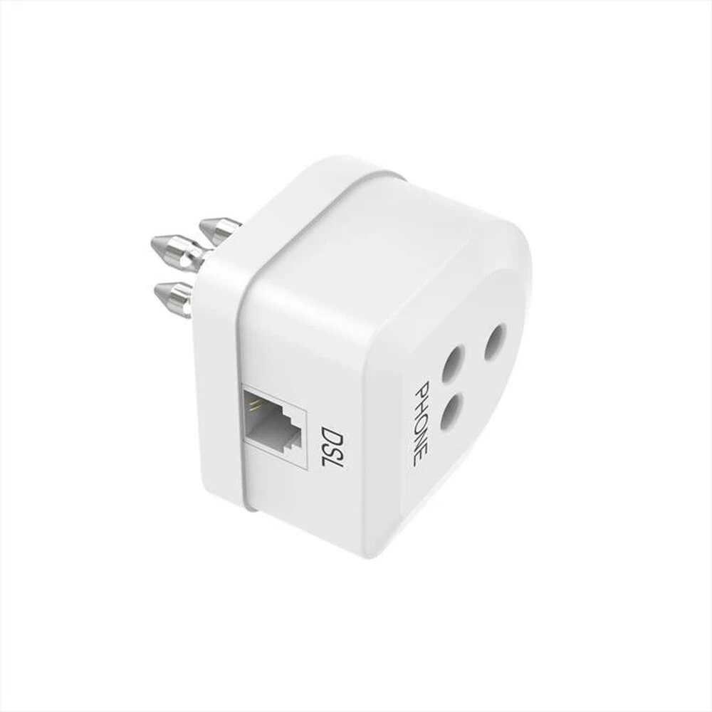 Filtro ADSL spina tripolare / presa tripolare – presa Jack 6p 4c – Filtro ADSL 3: spina Italiana 3pin Presa italiana 3 pin + presa modularee 6p2c Separa i segnali ADSL e analogico. Per collegare un terminale analogico (telefono,fax) con una spina modem ADSL a 3 pin (con spina modulare 6p2c)