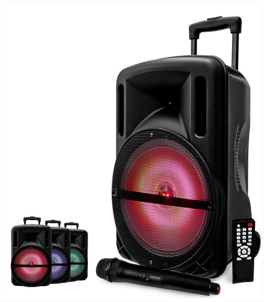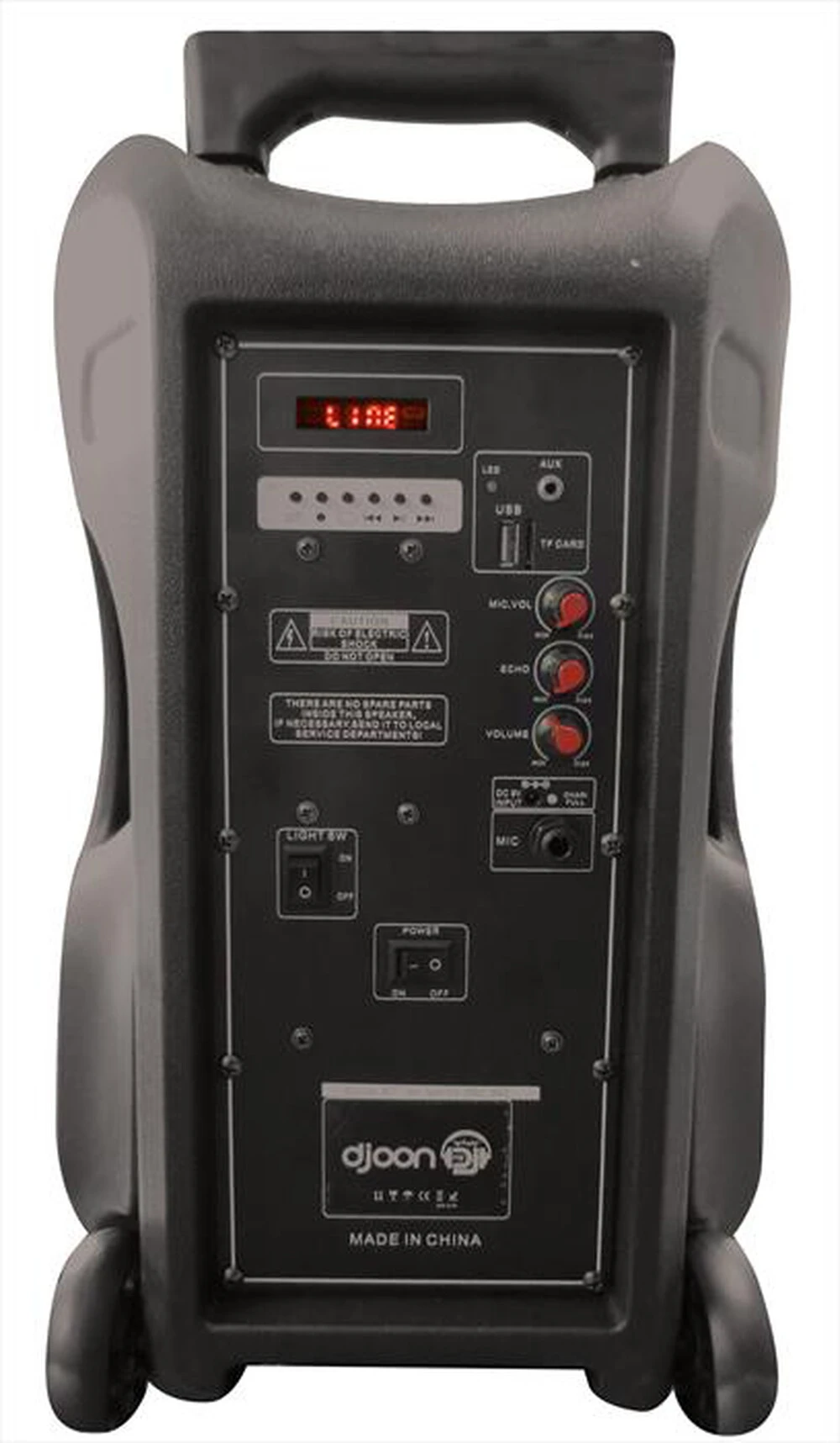 | Altre caratteristiche | • N. 1 ingressi line • 1 Ingressi microfonici • Lettore MP3 • Tweeter piezo 1" • Woofer 12" • Ruote Dispone di ruote per il comodo trasporto • Materiale di costruzione Materiale plastico (ABS) • Tipo di radiomicrofono: 1 microfono palmare • Risposta in frequenza: 20Hz – 20KHz • Lettore SD • Funzione di registrazione: registra direttamente su SD/USB • Potenza massima 500W pmpo • Bluetooth |