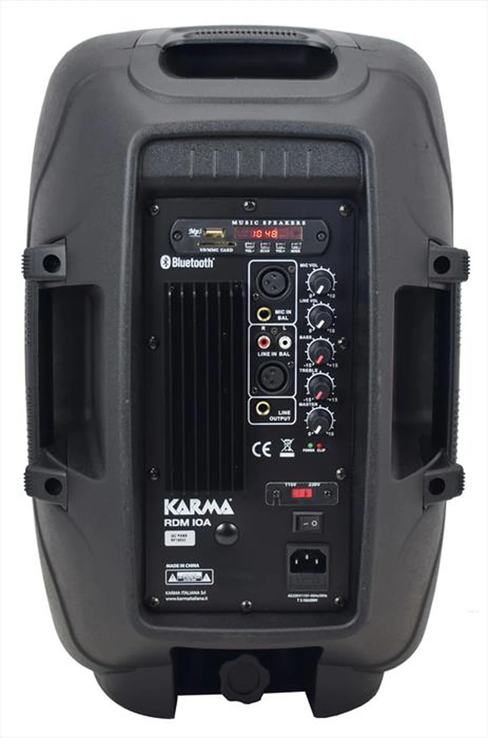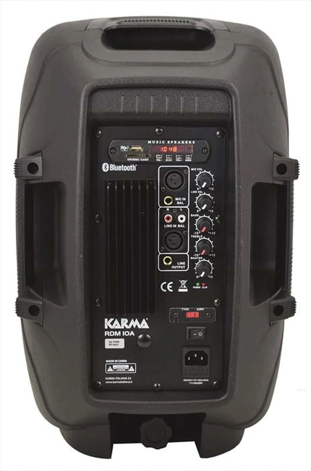 | Altre caratteristiche | – Potenza MAX 160W – Diffusore Amplificato – Dimensione Woofer 10" (25 cm) – Dimensione Tweeter 1" – Magnete 30 Oz – Bluetooth – Lettore SD e presa USB – Maniglie di trasporto – Bicchierino per supporto a treppiede – Risposta in frequenza 20Hz – 20KHz – Sensibilità 93 dB – N. ingressi line 1 – Ingressi microfonici 1 – Alimentazione 110V – 220V |