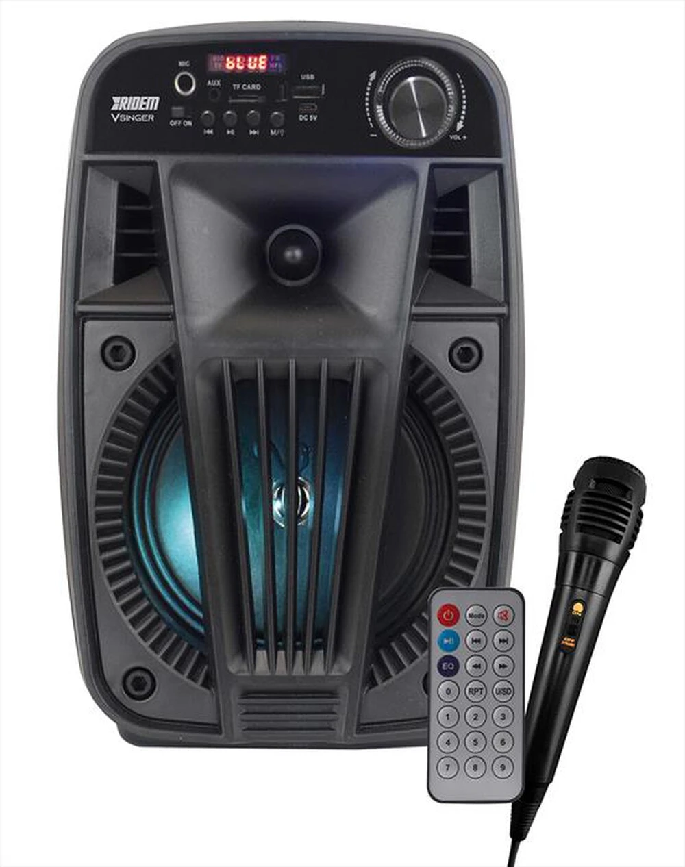 Canta le tue canzoni preferite grazie a questo diffusore amplificato che incorpora sia un lettore MP3 che una ricevente bluetooth. Riproduce i brani contenuti su chiavette USB o schede micro SD e i brani trasmessi da tablet, smartphone tramite bluetooth 5.0 Questo apparecchio dispone della innovativa funzione TWS che consente di riprodurre la musica da smartphone su 2 diffusori contemporaneamente tramite bluetooth. Viene fornito con telecomando per il controllo a distanza e microfono a filo per poterlo utilizzare immediatamente. Al”interno possiede una batteria ricaricabile tramite cavo USB(incluso). Il display mostra le informazioni sul brano riprodotto. Una presa AUX consente il collegamento di ulteriori apparecchi esterni (cavo 3,5mm incluso) Può essere posizionato su treppiedi grazie all’apposito foro inferiore.