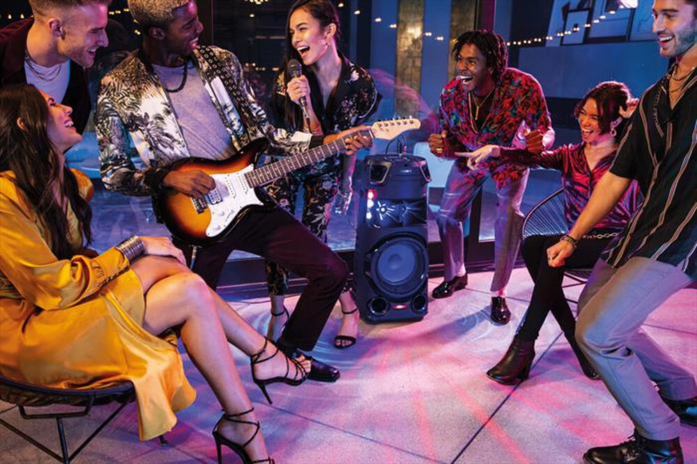 Sistema Mini – con Bluetooth 4.2 – USB – HDMI – File Riproducibili Audio: MP3 / WMA / WAV / AAC Video: Xvid / MPEG4 (simple profile)/ MPEG1 – Lettore DVD – lettore CD – radio – Sistema Home Audio (3 vie) Verticale Compatto ad Alta Potenza con LIVE sound, Party Lights e Gesture Control. Qualità audio Mega Bass e Jet Bass Booster, Dolby Digital, ClearAudio+. Riproduce CD, DVD, USB Play/Rec. Connettività wireless con Bluetooth, NFC e Wireless Party Chain. Utilità smart con le App Music center e Fiestable. Voice control e party light via App Fiestable. Gesture control verticale e orizzontale da pannello superiore. Uscita Video HDMI per TV, 1 ingresso/uscita audio analogico (per Party Chain Cablato), 2 ingressi microfono per Karaoke di cui 1 compatibile per chitarra. Design 1-box portatile con maniglia.