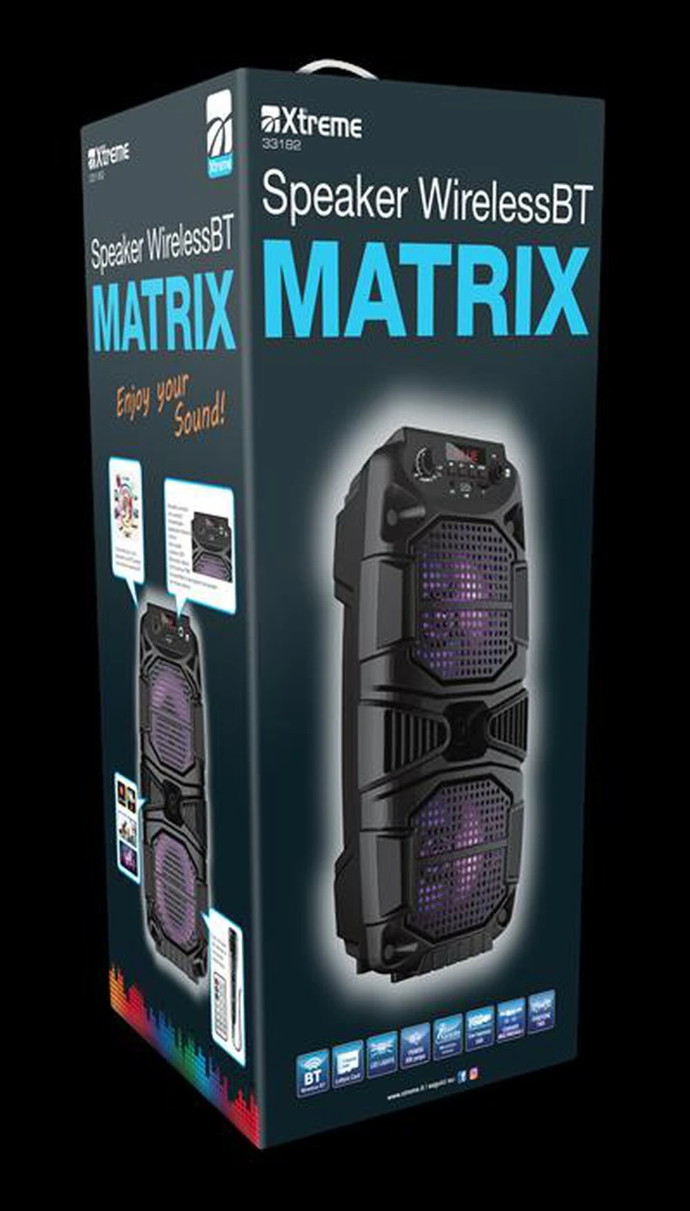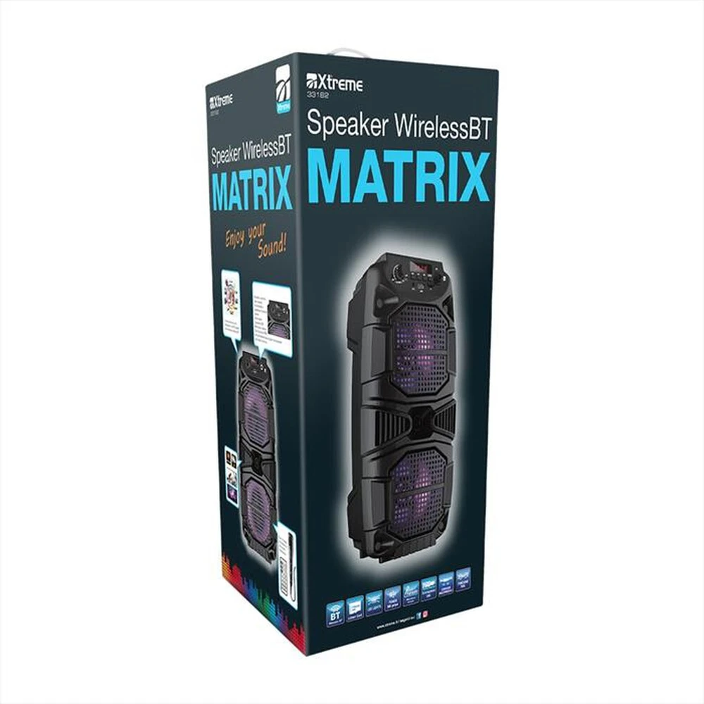| Descrizione marketing | Vivi la tua musica a tutto volume! Lo speaker BT MATRIX è stato progettato per una perfetta esperienza di audio, portando cosi festa ovunque tu voglia. Lasciati travolgere dai beat dei tuoi brani preferiti, anche se sei distante dallo speaker, grazie a questo potente sistema audio compatto. – Porta la festa sempre con te: a casa con gli amici o nel bel mezzo di un party, include maniglia integrata per la massima portabilità e praticità in tutta sicurezza. – Materiali di alta qualità : realizzato con materiale di alta qualità e cassa in MDF per un audio migliore. – Luci LED: crea un'atmosfera da party con gli speaker con illuminazione a LED: gli effetti luminosi pulsano a ritmo di musica. – Sii la star della festa: il divertimento è assicurato con il doppio ingresso per microfono che permette di cantare insieme ai tuoi amici i vostri brani preferiti. |