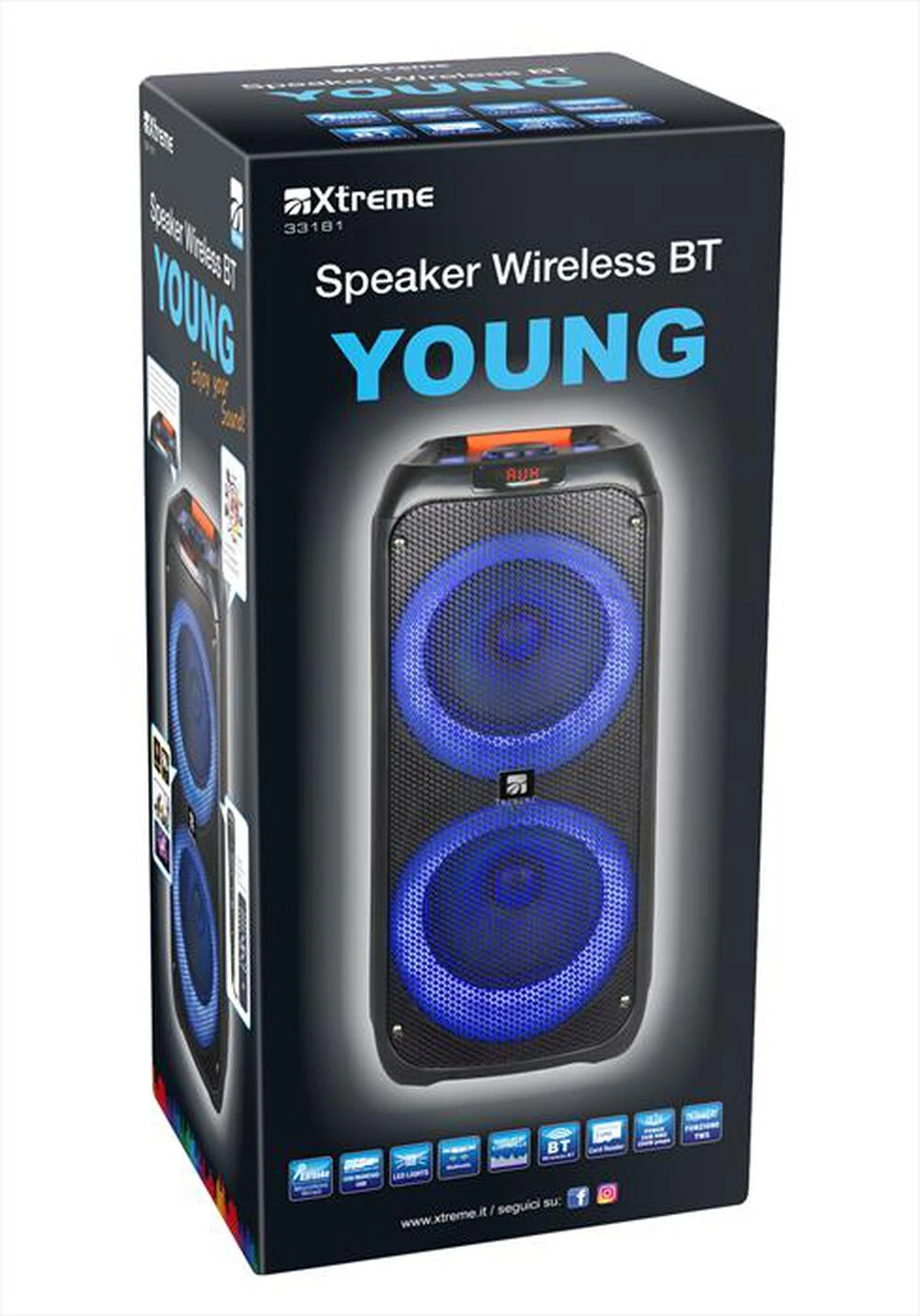 | Descrizione marketing | Vivi la tua musica a tutto volume! Lo speaker BT YOUNG è stato progettato per una perfetta esperienza di audio, portando cosi festa ovunque tu voglia. Lasciati travolgere dai beat dei tuoi brani preferiti, anche se sei distante dallo speaker, grazie a questo potente sistema audio compatto. – Porta la festa sempre con te: a casa con gli amici o nel bel mezzo di un party, include maniglia integrata per la massima portabilità e praticità in tutta sicurezza. – Materiali di alta qualità: realizzato con materiale di alta qualità e cassa in MDF per un audio migliore. – Luci LED: crea un'atmosfera da party con gli speaker con illuminazione a LED: gli effetti luminosi pulsano a ritmo di musica. – Sii la star della festa: il divertimento è assicurato con il doppio ingresso per microfono che permette di cantare insieme ai tuoi amici i vostri brani preferiti. |
